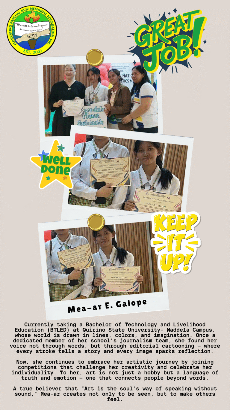 A passionate third-year BS Agriculture student at Quirino State University–Maddela Campus. A multi-awarded contender at Mr. and Ms. Agriculture 2025, Kenneth continues to showcase his artistry and confidence on stage and in visual arts. Guided by his belief that failure is a stepping stone to success, he now prepares to compete in Mr. Intramurals 2025, embodying resilience, creativity, and heart.